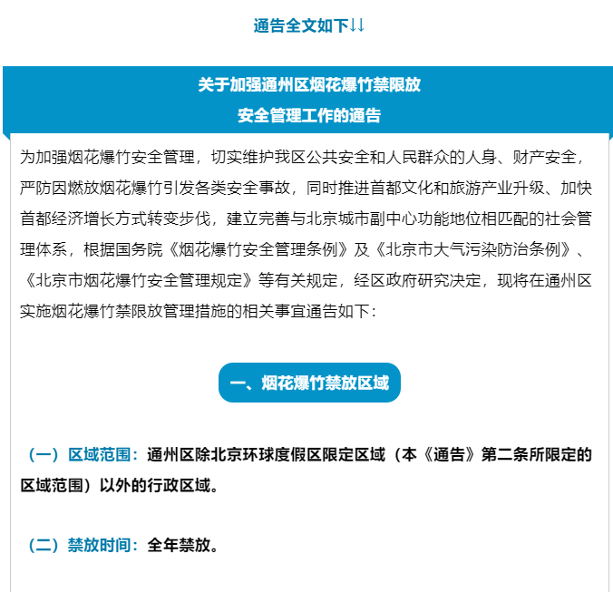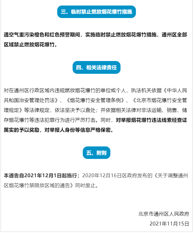 北京通州区人民政府发布了《关于加强通州区烟花爆竹禁限放安全管理工作的通告》。《通告》自2021年12月1日起施行。