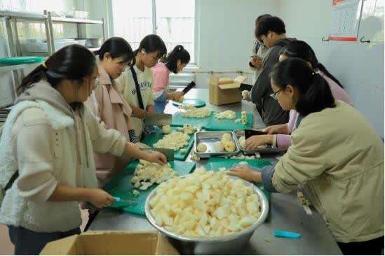活动当天正逢周末,参与制作冰糖雪梨的学生中午十二点半就到达食堂。两小时内处理完毕100斤雪梨、10斤冰糖等配料,下午五点,熬制工作基本完成。大一学生孙涛坦言,“一下午我都在不停地削皮切梨,胳膊都酸了。但是能让学长学姐喝上‘特制饮料’,觉得挺值得!”