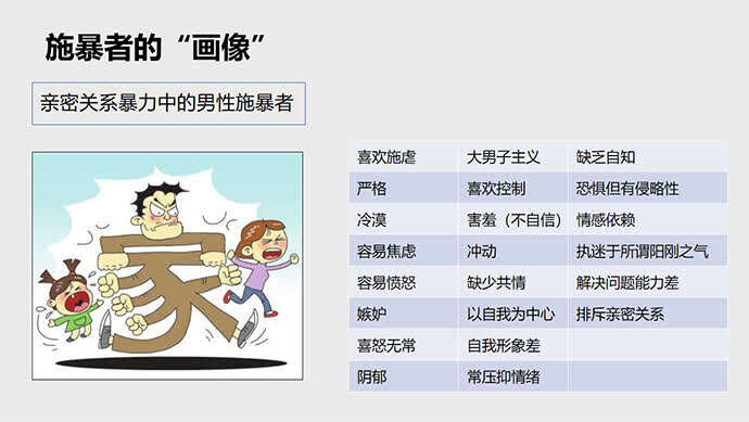 其次,是亲密关系中的男性施暴者。他们同样也有很多缺陷,包括喜欢施虐,或者本身比较严格、冷漠、容易焦虑、愤怒、嫉妒、喜怒无常、大男子主义、喜欢控制、不自信、冲动、缺少共情、自我为中心、自我形象差、经常压抑自己的情绪、缺乏自制力、胆小但有侵略性、具有情感依赖、执迷于阳刚之气、解决问题能力差、排斥亲密关系等等。如果存在以上这些问题的话,那么在亲密关系当中成为男性施暴者的可能性就比较大。
