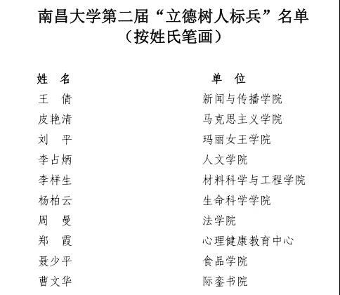 为全面贯彻落实党的十九大、十九届历次全会精神和习近平总书记在全国劳模和先进工作者表彰大会上的重要讲话精神,落实立德树人根本任务,进一步增强广大教师和教育工作者的责任感和荣誉感,促进学校教育事业蓬勃发展。学校决定授予王倩等十名教职工南昌大学第二届“立德树人标兵”荣誉称号。