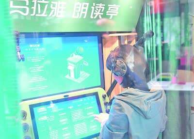 浙江省湖州市,顾客在书店朗读亭内选取内容进行录制,将音频分享给朋友。新华社发