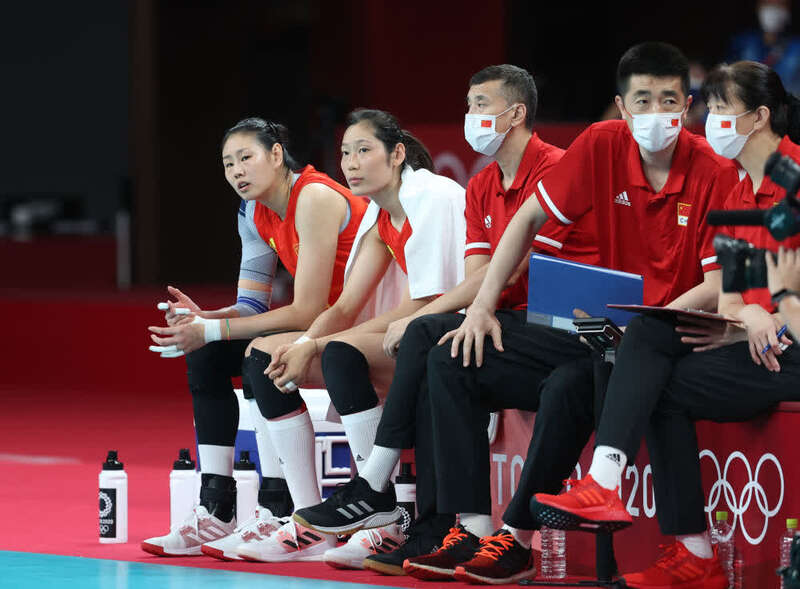 7月25日,东京奥运会排球女子小组赛,中国队球员朱婷(左二)在替补席休息。新华社记者 丁汀 摄