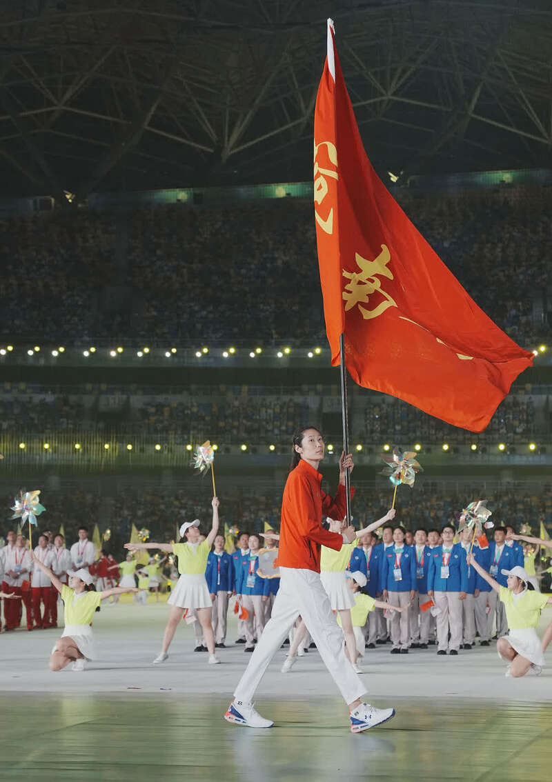 9月15日,第十四届全国运动会开幕式在西安奥体中心体育场举行,河南省体育代表团旗手朱婷在入场仪式上。新华社记者彭子洋摄