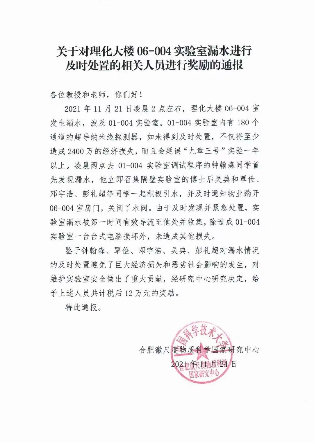 据合肥微尺度物质科学国家研究中心发布的一份通报, 11月21日凌晨2时左右,该中心理化大楼06-004室发生漏水,波及01-004实验室。值得注意的是,01-004实验室内有180个通道的超导纳米线探测器,如未及时处置,将至少造成2400万的经济损失,且会延误“九章三号”实验一年以上。5名学生因此共计奖励税后12万元。