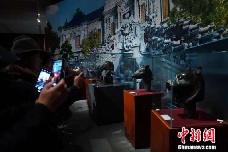 2019年11月,圆明园马首铜像捐赠仪式在中国国家博物馆举行。2019年11月,何鸿燊先生决定将马首铜像正式捐赠中国国家文物局,向中华人民共和国成立70周年和澳门回归20周年献礼。马首今后将回归原属地,由北京市圆明园管理处收藏。捐赠仪式后,马首铜像(右三)与其他六尊兽首铜像聚首京城,在国博“回归之路—新中国成立70周年流失文物回归成果展”上共同向观众展出。中新社记者 张兴龙 摄