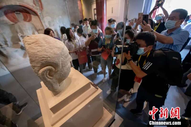 2021年7月,山西省太原市,天龙山石窟“第8窟北壁主尊佛首”正式回归原属地,并在天龙山石窟博物馆开幕的“复兴路上·国宝归来”特展上长期陈列展出。它成为近百年来第一件从日本回归天龙山石窟的珍贵流失文物。中新社记者 韦亮 摄