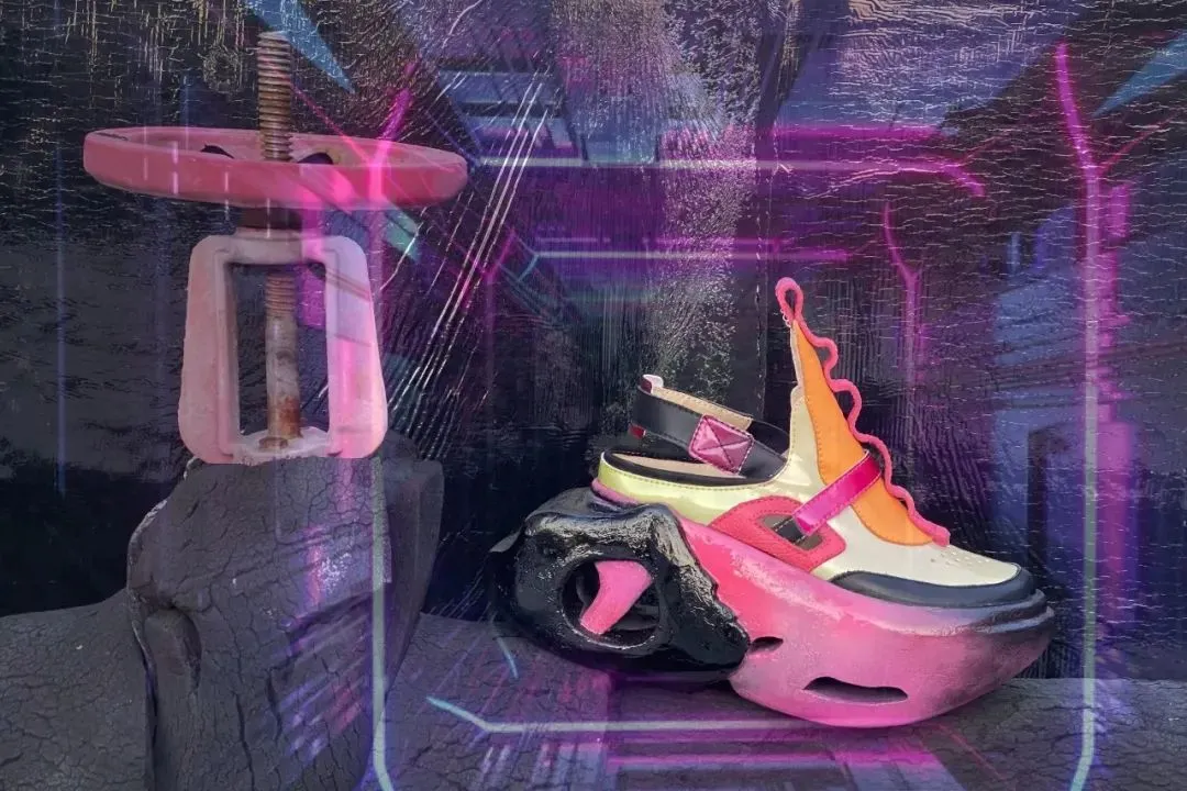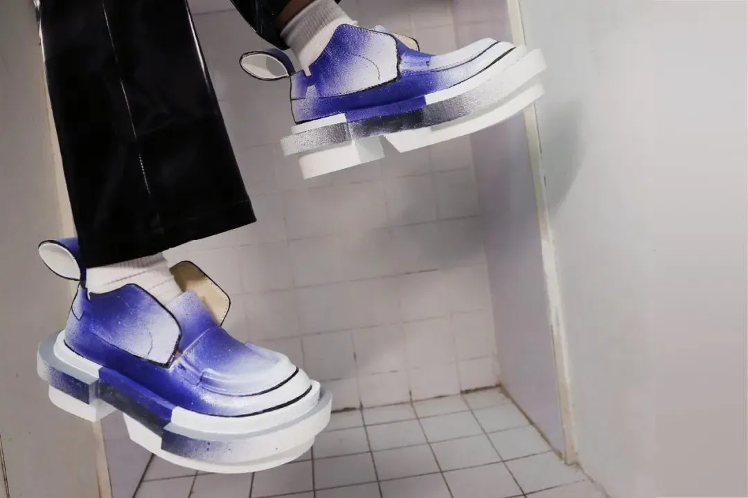 灵感来源于视错觉现象。利用放大镜作用与鞋身和鞋底,制造出局部放大的视觉效果,实现比例失调的特殊观感,仿佛置身于另一种镜界中。