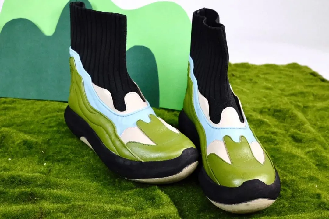 作品从层峦叠嶂的山脉中汲取灵感,以柔软轻薄的小羊皮为主要材料,填充泡沫棉来立体表现出山峦的层叠感,并提高鞋子整体的穿着舒适感,袜靴的图案则借鉴了大自然梯田的俯视纹样。这款鞋履通过柔软的皮质展现大自然的线条美感。