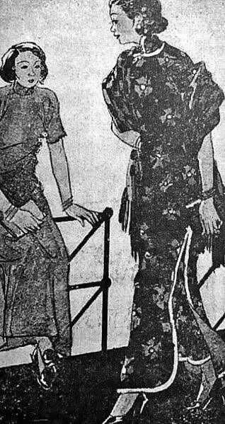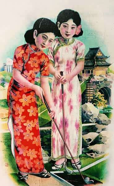 二十世纪三四十年代身穿“曳地旗袍”打高尔夫球的时尚女子,图中女子所穿的旗袍均为十字平面剪裁结构,无胸腰省,长度及脚面,并由丝袜取代了厚重的裤装。