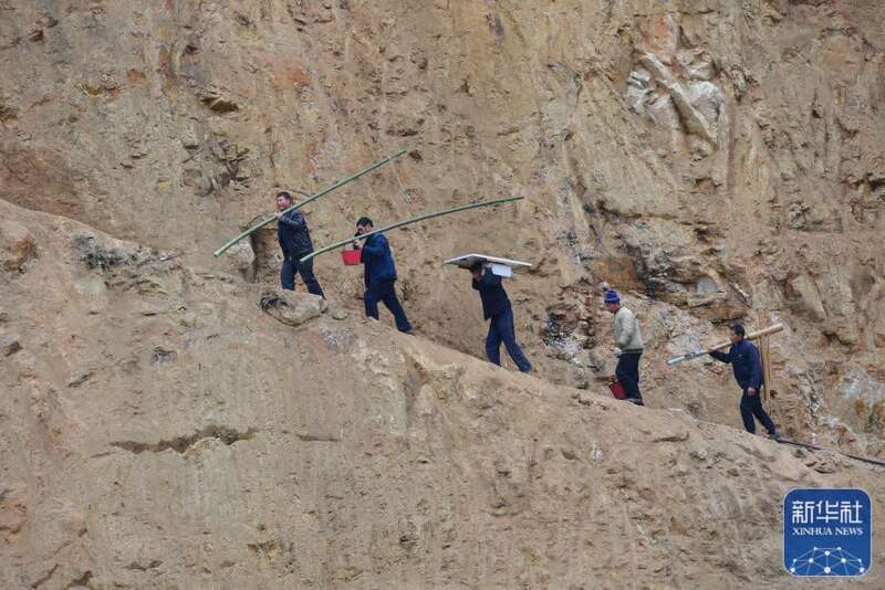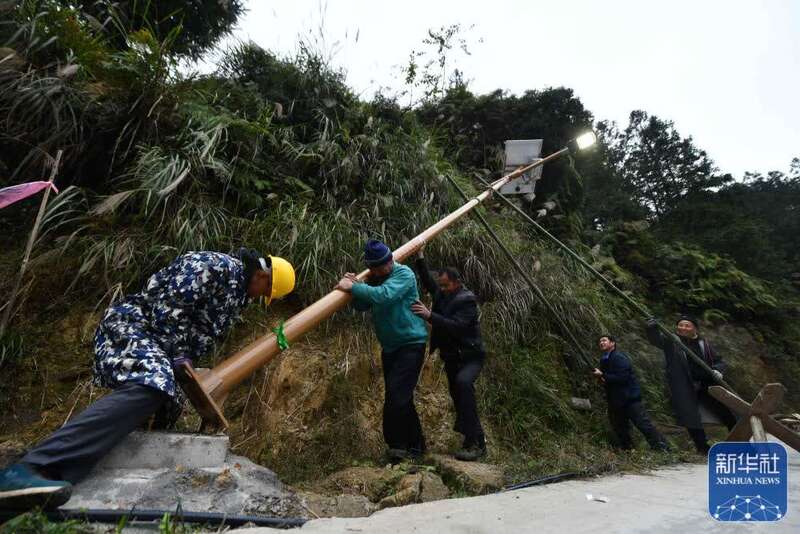 广西融水苗族自治县杆洞乡党鸠村村民在安装太阳能路灯(2020年12月7日摄)。