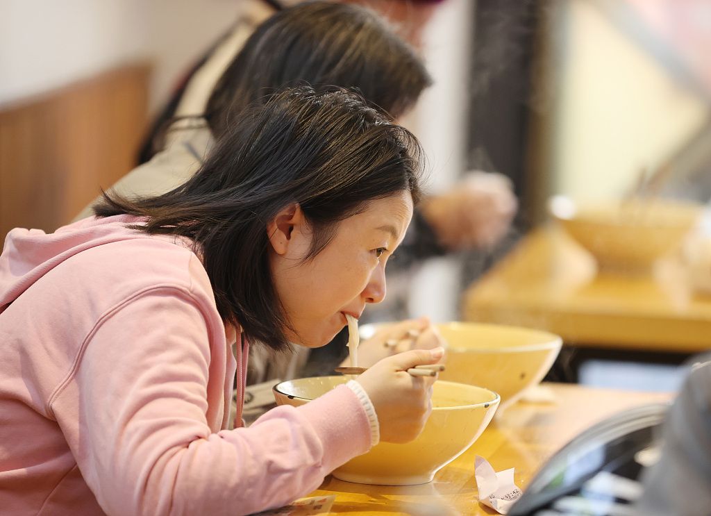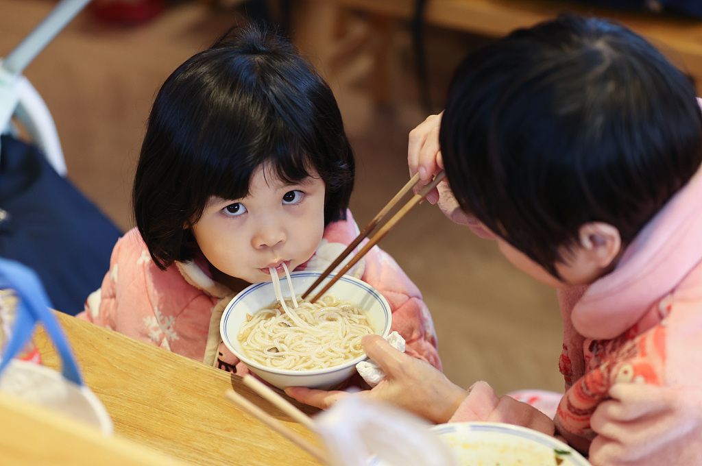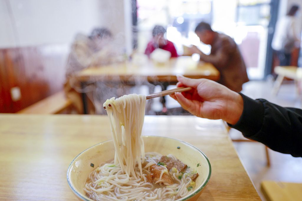 2021年11月27日,江西上饶,市民在早餐店吃粉。上饶人的早晨从一碗热气腾腾的米粉开始。去家楼下最熟悉的那家老粉店,吃上一碗老样子的米粉,新一天就有了最熨帖、热闹的开场。当日,上饶全域调整为低风险地区。