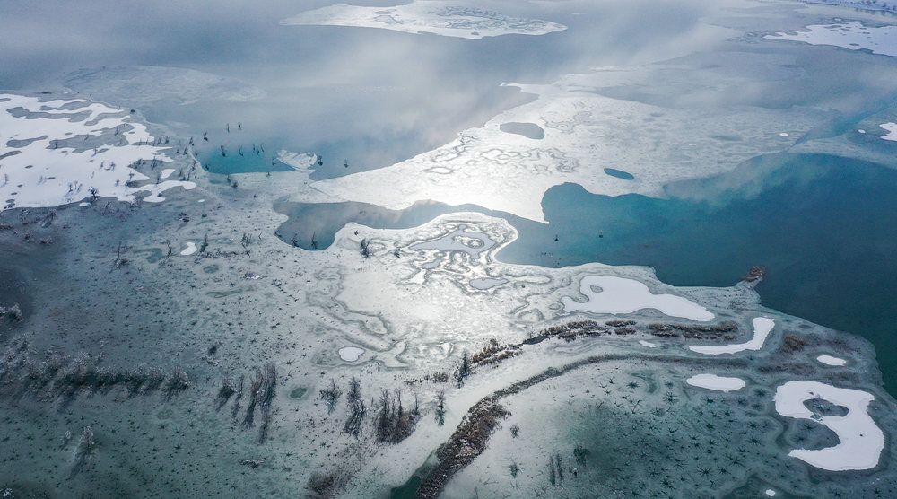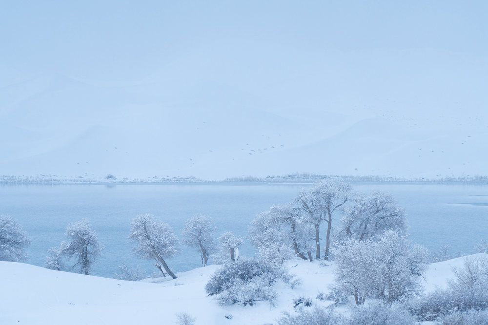 2021年11月28日,位于新疆巴音郭楞蒙古自治州尉犁县境内的塔克拉玛干沙漠迎来了降雪天气,连绵不绝的沙丘上犹如披上了银装,云雾在上空缠绕,沙漠、胡杨、湖泊时隐时现,宛若童话世界一般。塔克拉玛干沙漠降雪相对较为罕见,因此吸引了不少摄影爱好者前往采风。