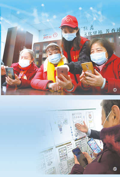 图①:重庆市沙坪坝区联芳街道平顶山社区,社区志愿者教老年人使用智能手机。