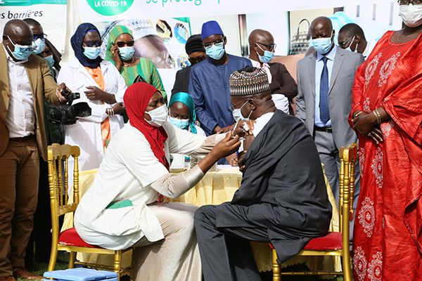 2月23日,塞内加尔前总理苏莱曼·恩德内·恩迪亚耶在首都达喀尔接种中国新冠疫苗。新华社 图