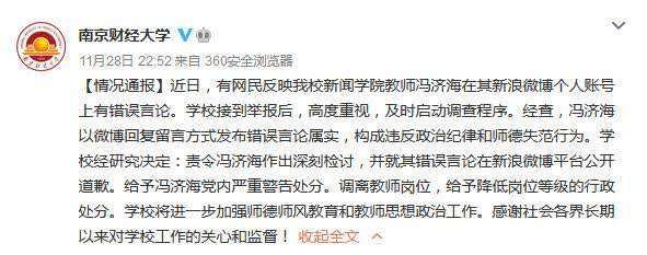 中新网11月29日电 南京财经大学28日通过官方微博发布通报称,近日,有网民反映该校新闻学院教师冯济海在其新浪微博个人账号上有错误言论。学校接到举报后,高度重视,及时启动调查程序。经查,冯济海以微博回复留言方式发布错误言论属实,构成违反政治纪律和师德失范行为。