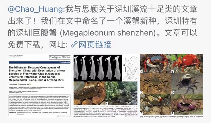 据羊城晚报报道,今年11月,最新一期动物学研究国际期刊Zoological Studies发表了黄超、毛思颖关于深圳山溪甲壳纲十足类(虾蟹类)的研究文章。