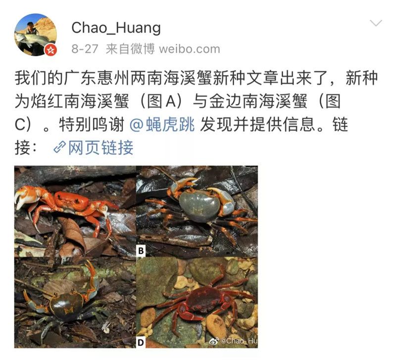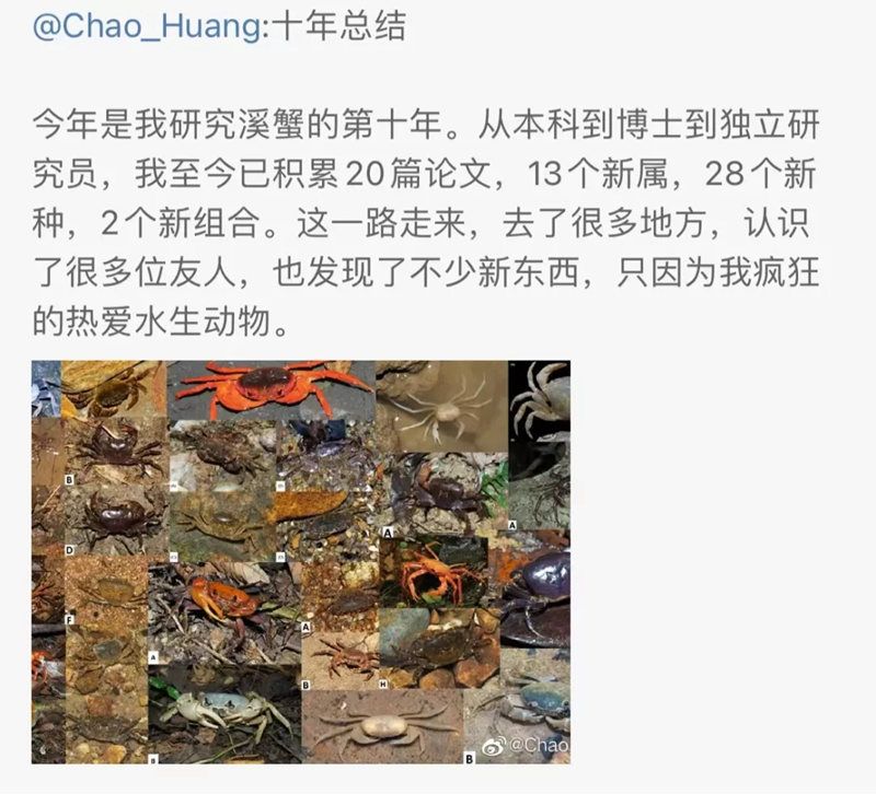 据了解,1991年出生的黄超本科毕业于中山大学生命科学专业,在澳大利亚新南威尔士大学获得博士学位,如今是独立研究人员与自由职业者,从事溪蟹研究已有10年之久。迄今为止,黄超已发现了28个溪蟹新物种。