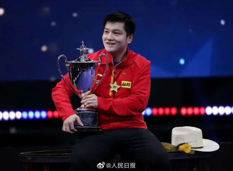 而在稍后举行的颁奖仪式上,当樊振东举起奖杯时,他不小心把奖杯盖子弄掉了,还砸到了自己的头......