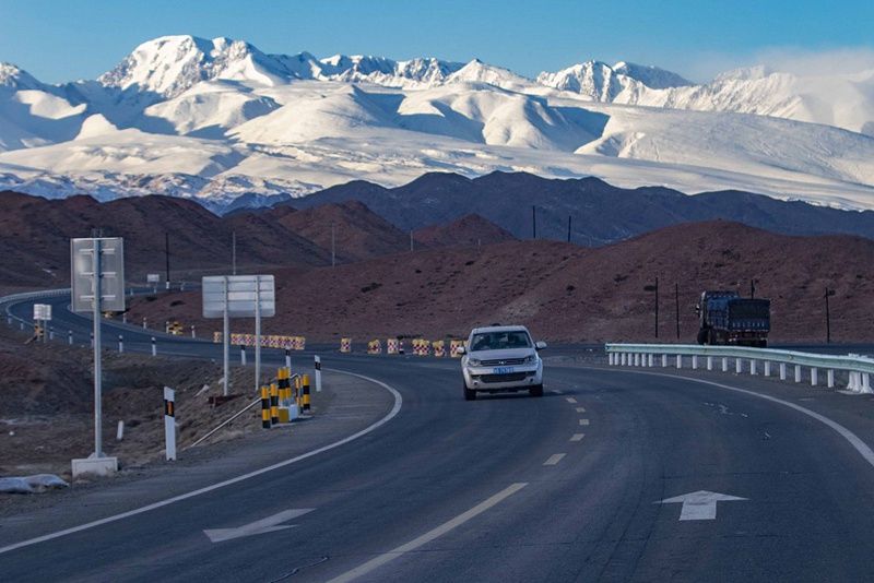 2021年 11月28日,一辆汽车在位于新疆哈密市伊吾县的东天山脚下的公路上行驶。