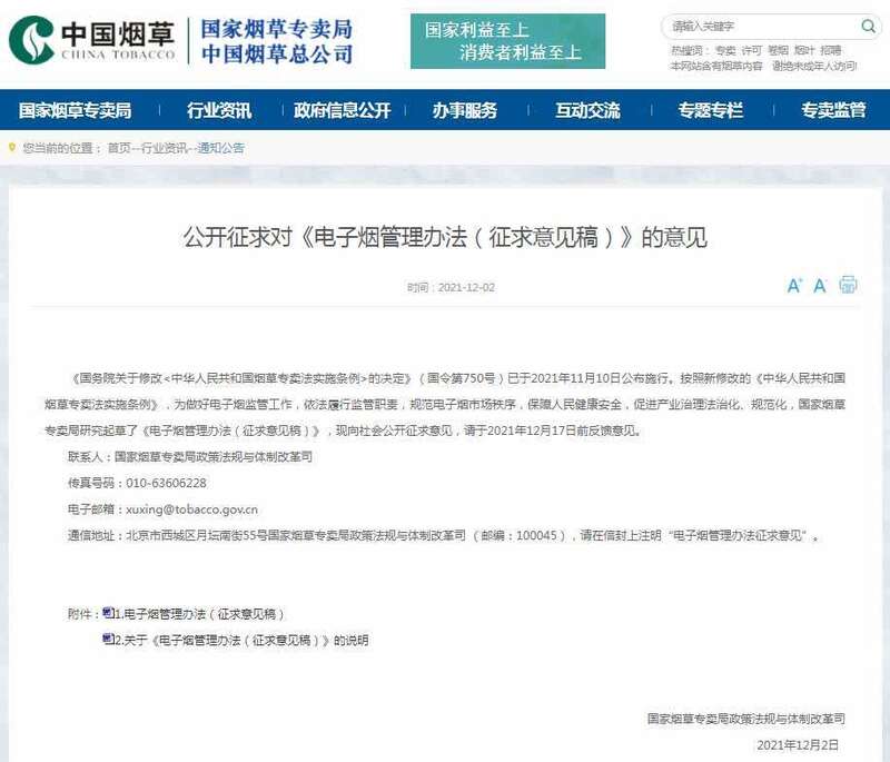 据国家烟草专卖局网站消息,按照新修改的《中华人民共和国烟草专卖法实施条例》,国家烟草专卖局研究起草了《电子烟管理办法(征求意见稿)》(以下简称《管理办法》),现向社会公开征求意见。其中: