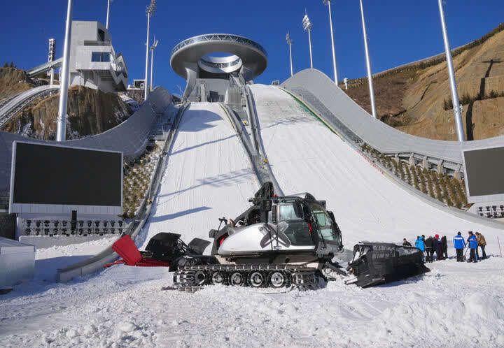 根据国际雪联的竞赛规程,为保障比赛安全、公平进行,跳台滑雪赛道在雪况方面对硬度、平整度有较高要求,因此需要使用人工造雪,并进行压雪、塑形以使赛道致密、平整。王波表示,目前国家跳台滑雪中心标准台造雪、压雪、塑形工作已经全部完成,满足测试赛比赛条件。