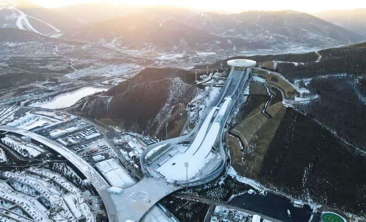 国家跳台滑雪中心位于河北省张家口市崇礼区古杨树场馆群西北部,是当今世界上体量最大的跳台滑雪场馆,由顶层回廊、竞赛区、看台区组成。明年冬奥会赛时,这里将举行跳台滑雪和北欧两项滑雪2个分项、8个小项的比赛,产生5块金牌。