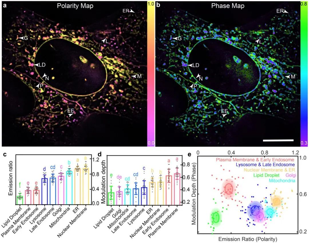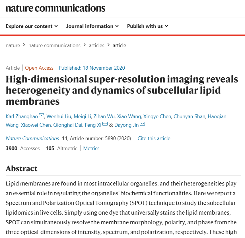 北京大学工学院席鹏教授研究团队联合南方科技大学金大勇教授团队成功开发了光谱偏振光学断层成像技术(SPOT),结合亲脂探针,从光强、光谱和偏振三个光学维度分别解析脂膜的形态、极性和相位,首次实现了细胞内10种亚细胞器膜的同时成像并对其脂质动力学进行了分析。这一工作发表在Nature Communications期刊。