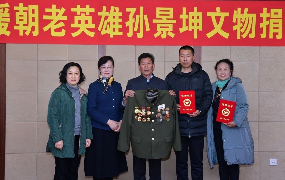因健康原因,孙景坤未亲临现场,他委托大儿子、二女儿、四女儿及二儿媳、大孙子等家人出席了捐赠仪式。孙景坤的大儿子孙福贵收到捐赠证书后表示,这些奖章被父亲视如珍宝,悉心保存,不管走到哪儿都要带在身边,是陪伴他几十年的心爱之物。在光荣院居住时,这些奖章就放在他触手可及的地方。即便生病住院,这件挂满奖章、纪念章的军装也挂到了父亲的病床边,他一抬眼便能看见。如今,把这些“宝贝”捐赠给抗美援朝纪念馆,实现了父亲今生最大的心愿。“作为孙景坤的儿女,我们感到无比骄傲和自豪。我们一定会以父亲为榜样,老老实实做人,踏踏实实做事,将这份精神力量永远传承下去。”