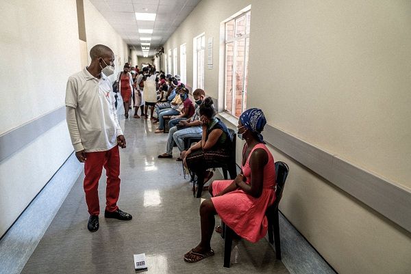 当地时间2021年12月1日,在南非约翰内斯堡附近的 Lenasia South 医院,一名医院工作人员确保人们在排队等候接种疫苗时保持社交距离