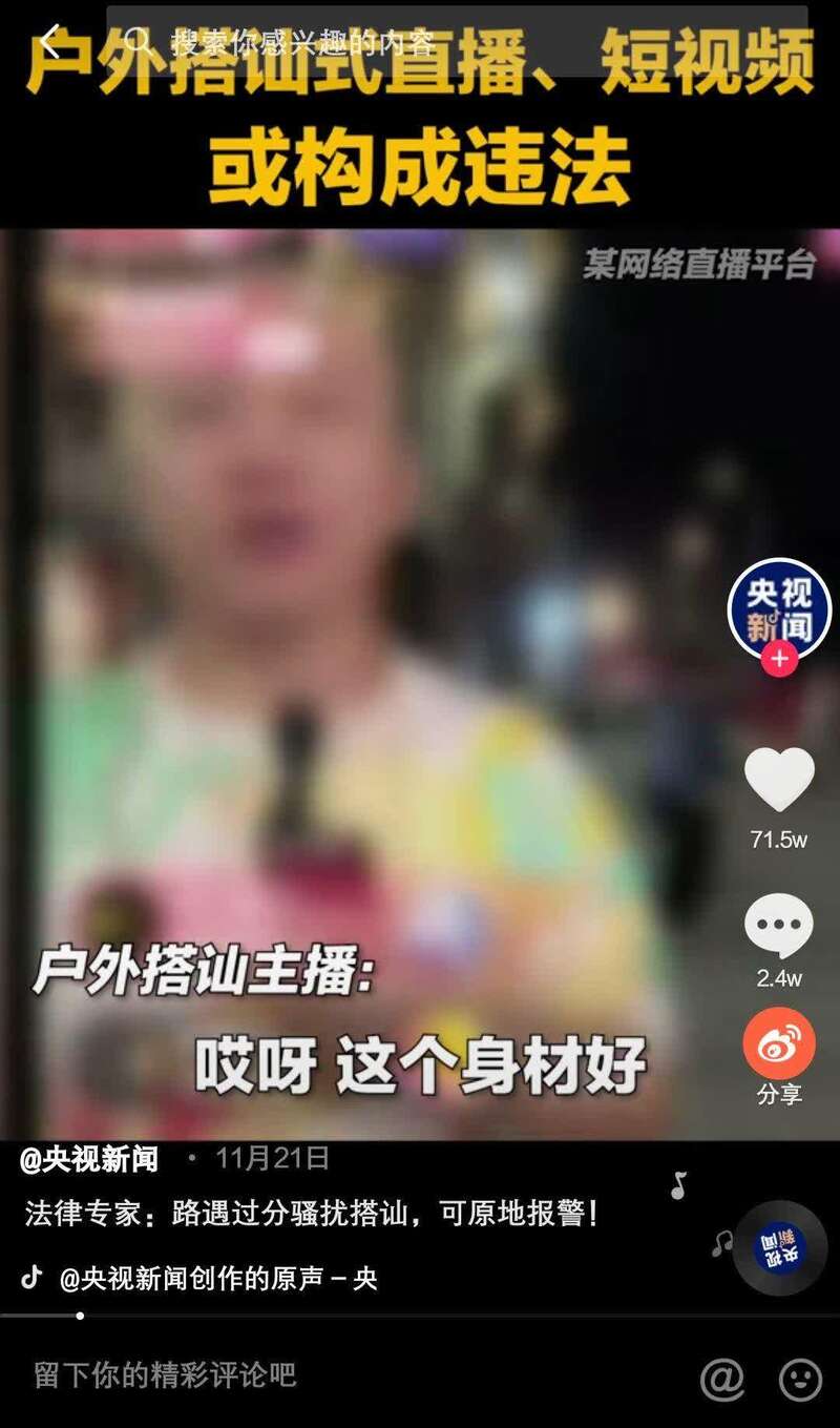 此类户外搭讪式直播并不是这段时间才兴起的,去年就曾有媒体报道过某网络主播街头直播搭讪骚扰路过女性,跟踪拍摄对方并索求亲吻,对当事女性构成骚扰行为。这名主播的账号此后被相关平台封禁,但此类直播乱象并没有得到有效遏制。各类直播平台中仍然存在不少户外搭讪直播,其中有不少主播的观看人数甚多。