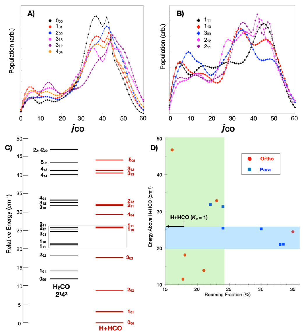 以甲醛单分子光解反应为例。当基态甲醛分子吸收光子跃迁到电子激发态S1态后,可解离生成自由基产物H+HCO和分子产物H2+CO两种物种。若反应按如下两步发生:首先是甲醛分子中的一个C-H键伸长,H原子离去快要生成却并未生成产物H+HCO;其次是远离的H原子没有继续远离而是返回与另一个H原子结合并最终生成产物H2+CO,则此为“漫游”反应。