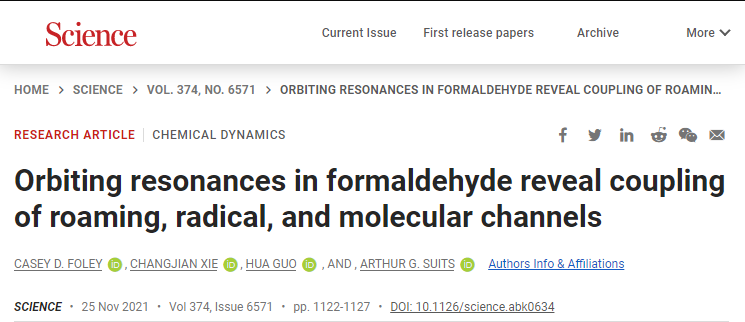研究成果以“Orbiting Resonances in Formaldehyde Reveal Coupling of Roaming, Radical and Molecular Channels”为题在Science上发表(Science 374, 1122 (2021),Research article)。
