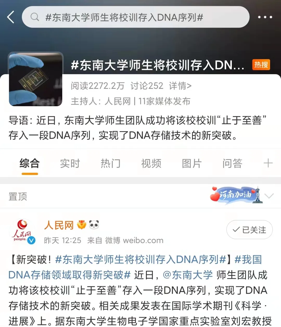 近日,因为将校训“止于至善”——“Rest in the highest excellence!”作为数据写进了DNA分子里,并将科研成果成功发布在Science Advances上,东南大学生物科学与医学工程学院、生物电子学国家重点实验室的刘宏团队受到了大家的关注。这样硬核的技术和独特的巧思,不由得让人大呼“工科人的浪漫”。