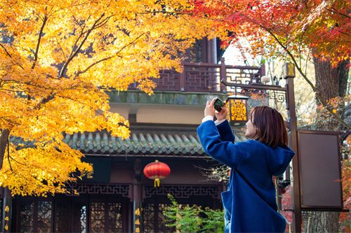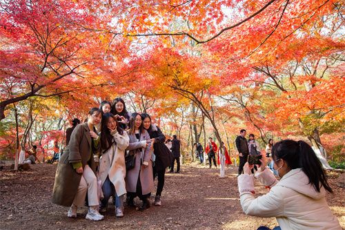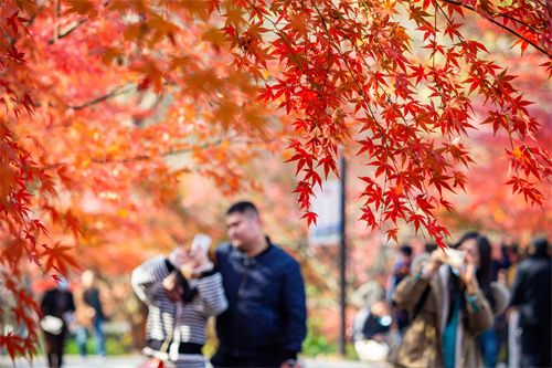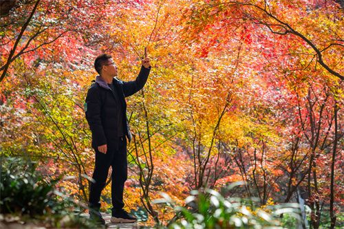 2021年12月4日,冬日的南京栖霞山风景区层林尽染,景色如画,景区内的枫叶已进入最佳观赏期,吸引不少游人前来观赏。