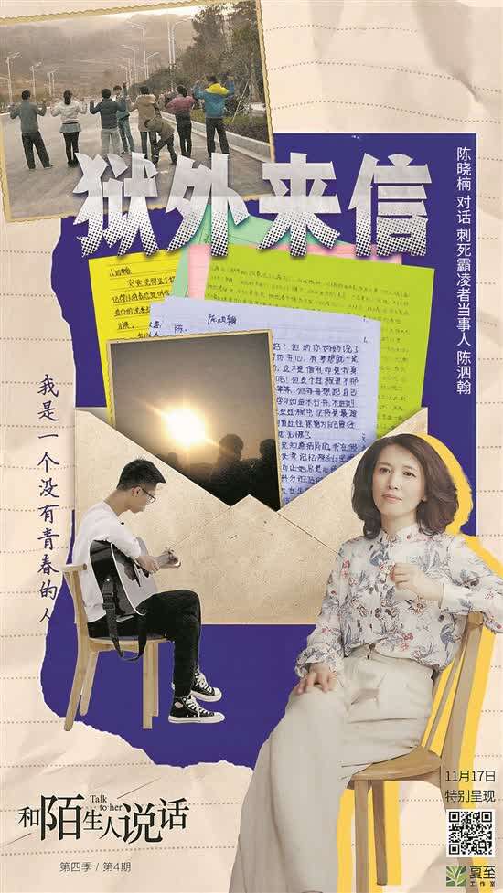 2014年,中考前13天,15岁的陈泗瀚因刺死校园霸凌者接到逮捕通知,后因故意伤人罪被判入狱,走上一条与同龄人截然不同的道路。2020年8月,陈泗翰带着一百多封“狱外来信”走出监狱。他的故事出现在本季《和陌生人说话》里,节目播出后,他从新闻中的符号转变成一个有血有肉的人。之后,陈晓楠更新社交平台动态:“什么能够真正救赎一个人?我觉得,还是爱。”