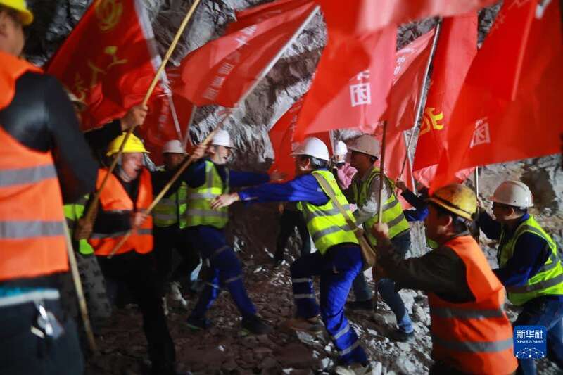 12月5日,工作人员庆祝九万大山一号隧道平行导洞贯通。