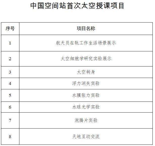 本次太空授课活动将采取天地互动方式进行,在中国科技馆设置地面主课堂,在广西南宁、四川汶川、香港、澳门设置地面分课堂。届时3名航天员将在轨介绍展示中国空间站工作生活场景,演示微重力环境下细胞学实验、物体运动、液体表面张力等现象(授课项目附后),并与地面课堂进行实时交流,传播载人航天知识,激发广大青少年对科学的兴趣。