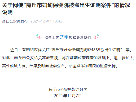 近日,有网络媒体关注“商丘市妇幼保健院被盗4885份出生证明”一案。对此,商丘市公安机关高度重视,将在前期侦查调查的基础上,进一步加大案件侦破力度,结果及时向社会公布。感谢媒体和网民的监督支持。