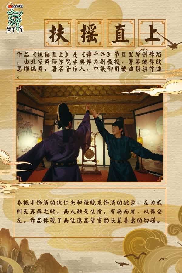 节目第一期,设计成曹操在晋封魏王后于铜雀台举办的一场舞会,荐舞官们化身曹丕、曹植、司马懿、杨修、甄宓,每一句对白都暗藏交锋,符合各自的人物设定。席间,胡阳与徐明浩还来了一段刚柔并济的双人剑舞。第三期中行云流水的《越女凌风》,更是满足了观众对武侠剑术的诸多幻想。