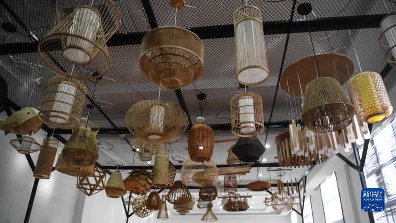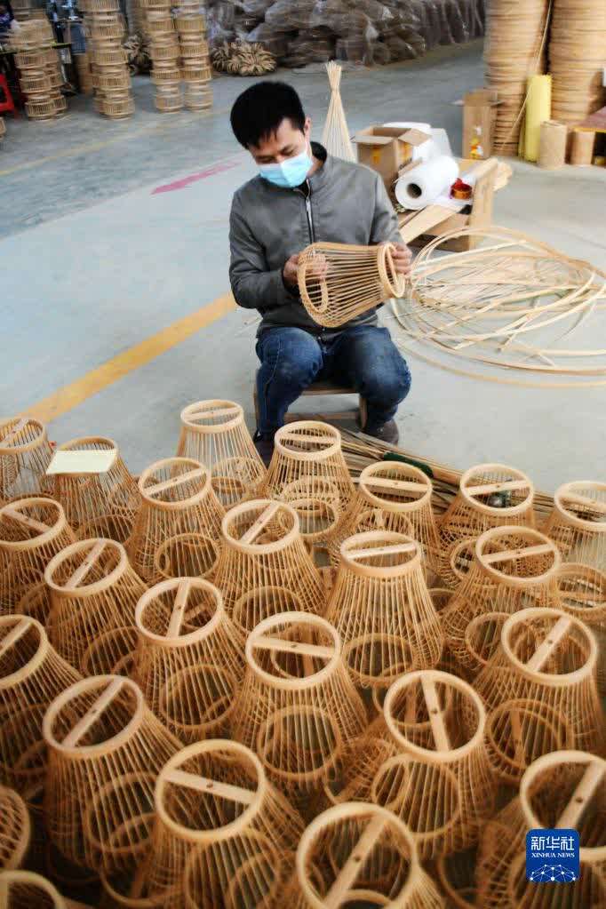 12月6日,融安县一家工艺品厂的工人在车间检查竹木灯饰半成品。
