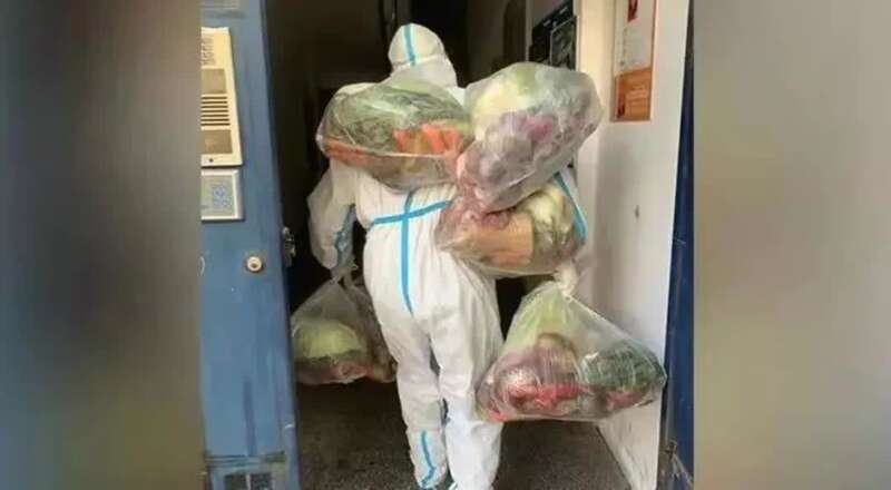 江西上饶,志愿者余哲明肩扛手提,身上挂满百余斤蔬菜。