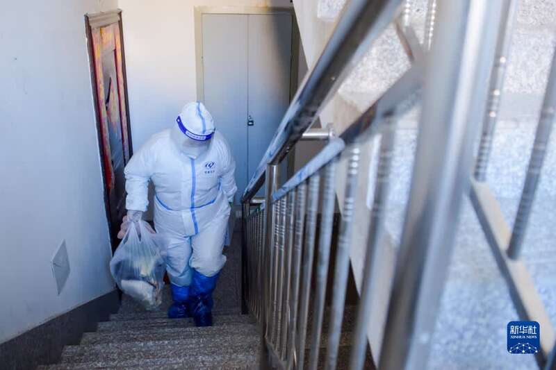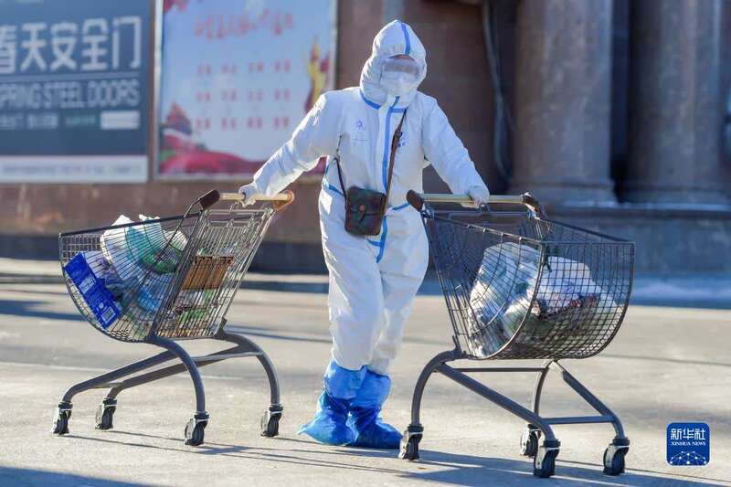 12月5日,在满洲里市尚都国际小区,志愿者为居民送物资。