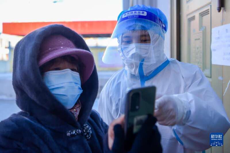 12月6日,在满洲里市新元国际小区,志愿者为前来进行核酸采样的居民录入信息。