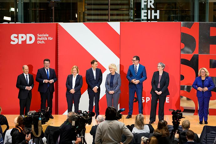 当地时间2021年12月6日,德国柏林,社民党确认了将出任内阁部长的人选,德国总理候选人朔尔茨召开发布会,向外界介绍将代表社民党出任联邦内阁部长的人选。新任内阁将于12月8日正式宣誓就职。人民视觉 图