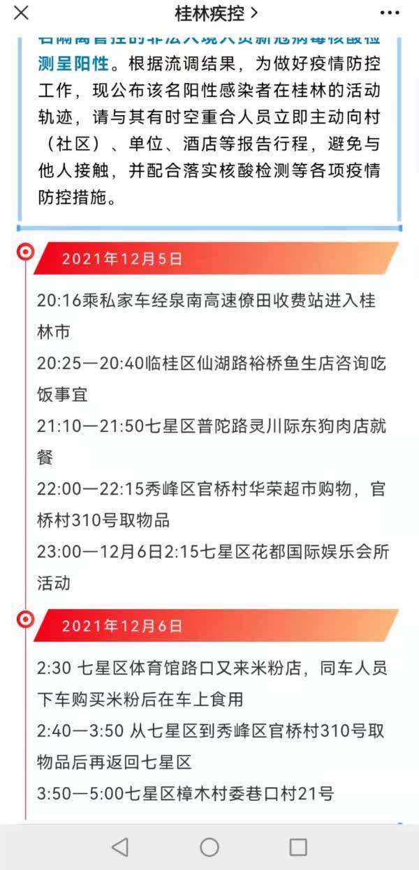 据“桂林疾控”12月7日消息,12月6日,广西桂林市疾控中心报告1名隔离管控的非法入境人员新冠检测呈阳性。该人员活动轨迹显示,该人员乘私家车经泉南高速僚田收费站进入桂林市,此后曾出现在临桂区仙湖路裕桥鱼生店、七星区普陀路灵川际东狗肉店、秀峰区官桥村华荣超市、官桥村310号、七星区花都国际娱乐会所活动、七星区体育馆路口又来米粉店、七星区到秀峰区官桥村310号和七星区樟木村委巷口村21号。