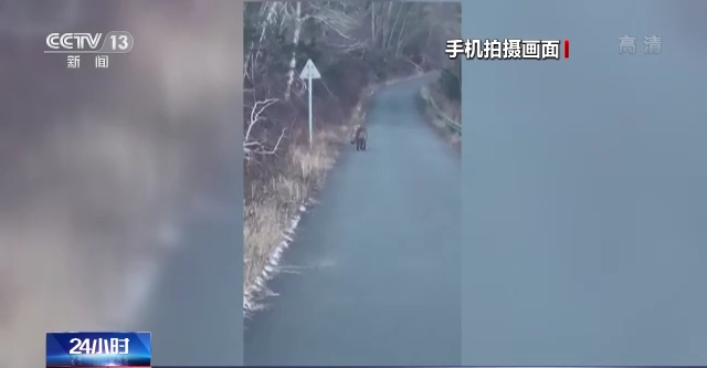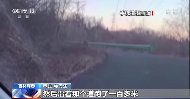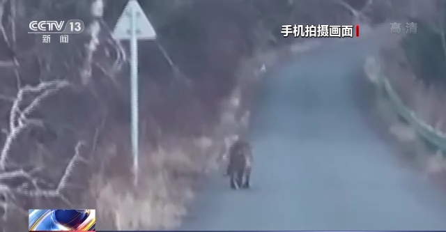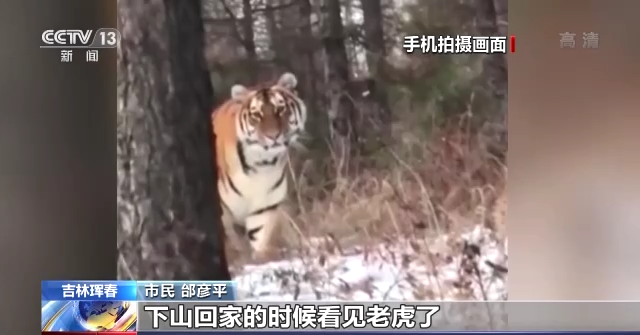市民 邰彦平:11月28日下午大概3点半左右,就看见老虎了,当时我就懵了!老虎也不走,我开着车也不敢走,我俩就在那瞅着,它瞅我,我瞅它。我就拿出手机开始录视频,看了它一会儿,它起来走了,我就稍稍再往前走点儿,它又趴那不动弹了。我又拿着手机录了一会儿,录了一会儿,老虎起来瞅瞅我,转身就走了,把我吓得也赶紧就开车往家跑。活这么大,头一次那么近距离看老虎!