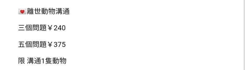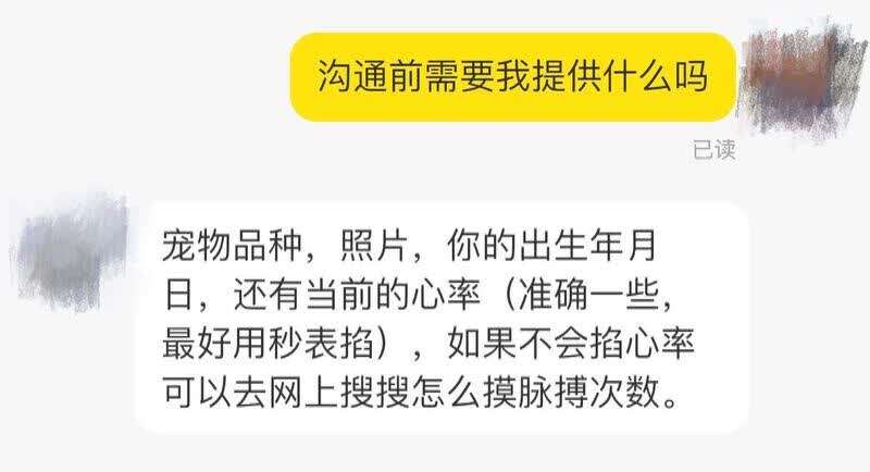 “有供有需”的平台不止是闲鱼,小姚就是在微博上找到宠物沟通师的。与闲鱼卖家相比,这位沟通师要显得“专业”得多。据小姚介绍,她自称不仅可以与在世动物沟通,还可以与离世动物建立联结。尽管同样按照问题数量收费,但三个问题就需195元,五个问题则要收费300元。“她挺忙的,需要七个工作日左右才会回复沟通结果。”小姚向记者分享。在正式开始沟通之前,小姚按照沟通师的要求,提供了宠物眼睛看镜头的近照、宠物活动区域的照片、日常训练互动的视频以及她本人和家人的照片。