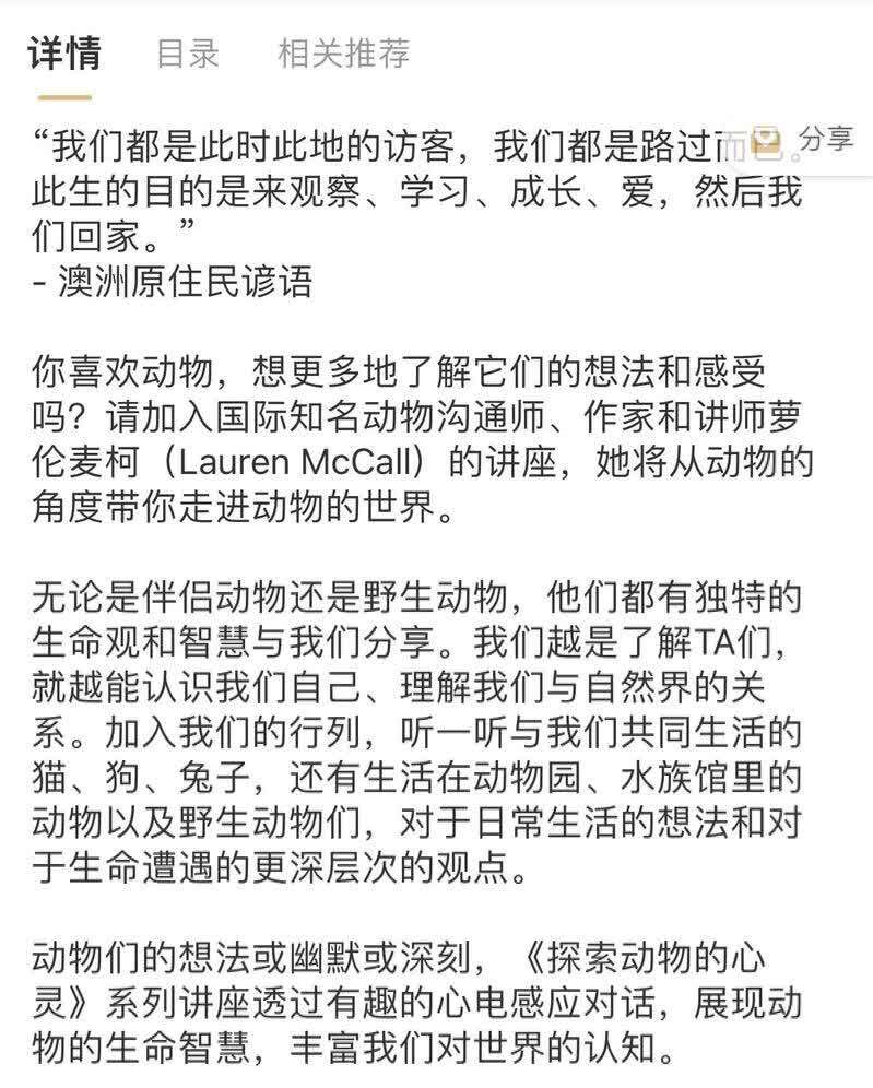 2020年,一家名为“六只脚”的犬类行为训练中心推出了“探索动物的心灵”系列动物沟通线上讲座。根据小程序中的介绍,该讲座的主讲,正是前文的国际知名动物沟通师萝伦·麦柯。讲座共分为八讲,每讲内容不超过二十分钟,售价为98元。记者购买后发现,讲座音频内容为中英双语,在每一段英语内容的后面,都“贴心”地紧跟着中文翻译。因而,如果去掉内容上的重复,每一讲其实还不足10分钟。