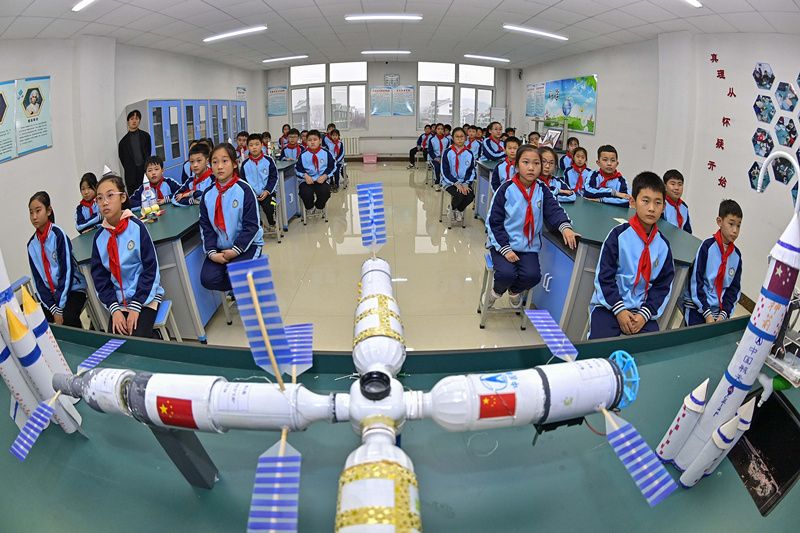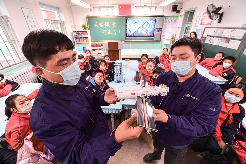 2021年12月9日,沈阳,和睦路小学,学生收看“天宫课堂”。沈阳航天新光集团有限公司工作人员手持1比60比例空间站天和核心舱给孩子们讲述航天知识。