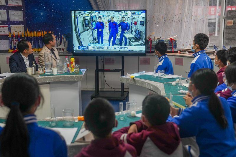 2021年12月9日,北京市第十八中学的科技展览室内,中科院国家空间科学中心研究员周炳红(左一)、物理特级老师罗倩敏(左二)与同学们一同观看太空授课。